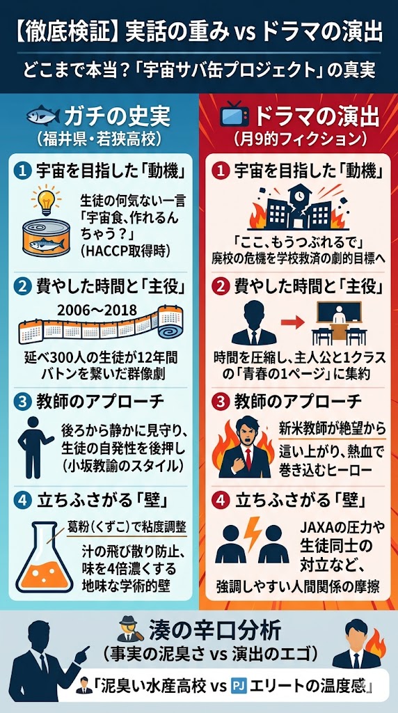| 宇宙を目指した「本当の動機」 | 2006年に高校としてHACCP(食品衛生管理)を取得した際、生徒が放った「宇宙食、作れるんちゃう?」という何気ない一言から発進。 | 「ここ、もうつぶれるで」という、学園ドラマの古典的クリシェ(廃校の危機)を導入。学校を救うための劇的な目標として設定。 |