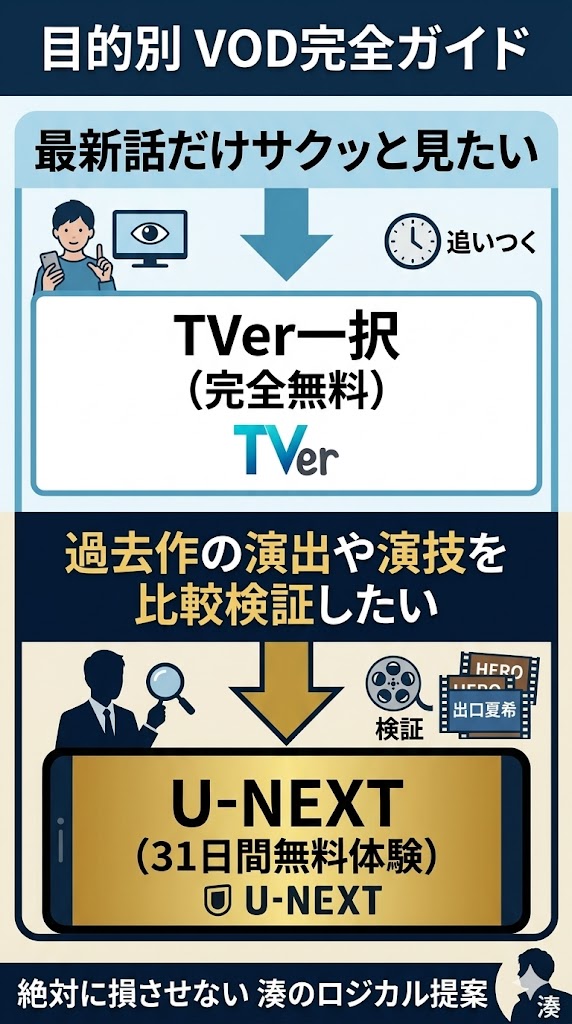 そういう方は、迷わずTVer(ティーバー)を開いてください。無料で手軽に追いつける、これが唯一にして最強のインフラです。