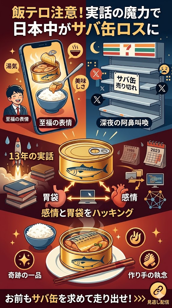 なぜ僕らは、深夜に家を飛び出すほどサバ缶を欲したのか?それは、画面越しに見せつけられたあの黄金色に光るサバの身と、それを白米と共にかき込む生徒たちの至福の表情が、「宇宙に持っていく究極の味を求めた、13年に及ぶ血と汗の結晶(実話)」だと知ってしまったからです。