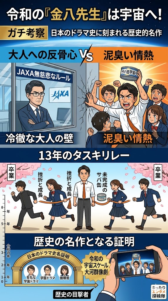 世代を超えて受け継がれる執念と、恩師との別れ。このドラマは、単なる1クールの消費エンタメではありません。何世代にもわたる生徒たちの挫折と成長の連鎖を追体験する、極上の大河群像劇です。僕がエンタメ探検隊の看板に懸けて、この作品が日本のドラマ史に刻まれる歴史的名作になることを、ここで証明します。