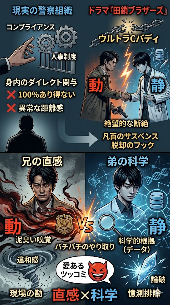 面倒くさがりな兄が長年の現場の勘で捉えた些細な違和感を、冷徹な弟が科学的根拠(データ)で完膚なきまでに論破していく。このバチバチのやり取りがたまらないんです。「設定に無理がある」と愛あるツッコミを入れつつも、僕に言わせればリアリティとフィクションのギリギリの境界線をあえて攻めているからこそ、この「直感×科学」の対立構造がドラマを爆発的に跳ねさせるに決まっています!