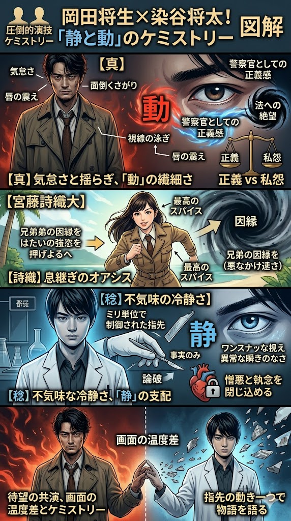 しかし、僕から言わせれば、その「フィクション特有の無理な設定」や「胃が痛くなるほどの重さ」こそが、このドラマの最大の魅力なんです。綺麗に整頓された無難なドラマが溢れる現代において、本作はあえて視聴者の心に「理不尽」という泥を投げつけてきます。この強烈な「毒」と、それを中和するために岡田将生(兄・真)と染谷将太(弟・稔)がぶつかり合うバチバチの熱量。これこそが、僕たちが深夜まで寝不足になりながらも考察に熱狂してしまう「熱量の正体」に他なりません!