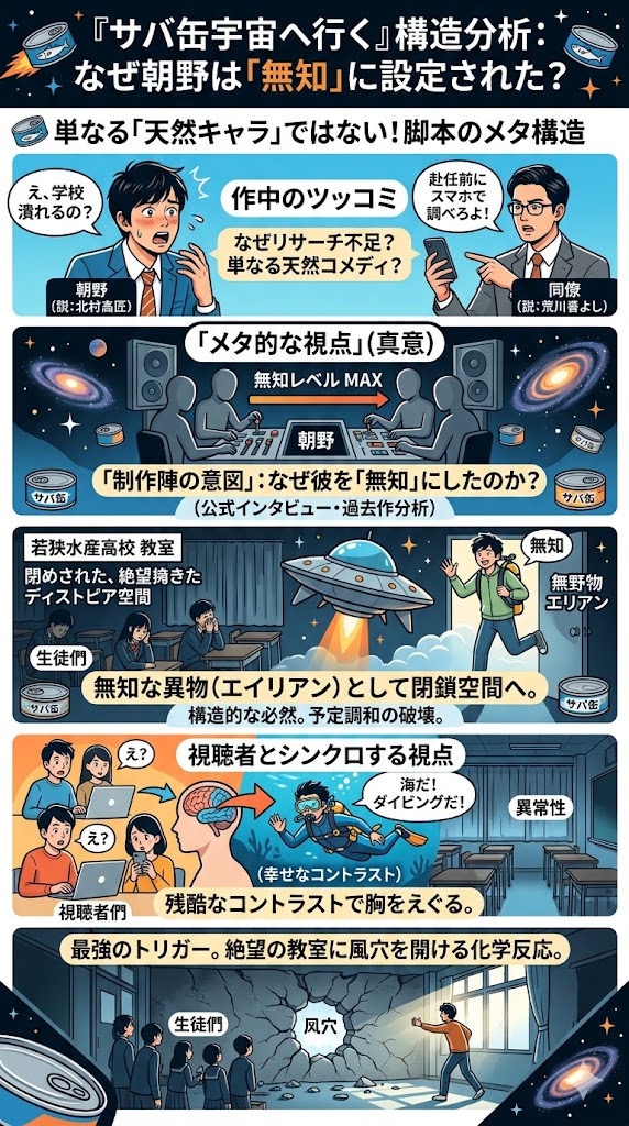 A:ここからは僕の独断と偏見による断定だけど……サバ缶は「鮮度を閉じ込めたまま、時が止まったもの」の象徴なんだ。若狭水産高校の生徒たちは、地方の閉塞感の中で、自分の可能性を缶詰のように密閉してしまっている。あの冷めきった教室は、いわば「巨大な冷蔵倉庫」。1話のラストで朝野先生が見せたあの能天気な笑顔が、いつこの「冷めた缶詰」を温め、中身を宇宙へぶちまけてくれるのか。タイトル自体が、「凍りついた青春の解凍」を予言する最大のメタファーになっていると僕は睨んでいるよ。