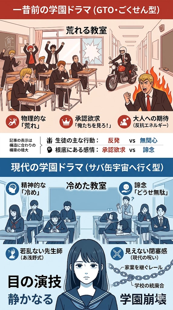 では、この絶望的に冷めきった教室は、かつての学園ドラマの生徒たちと具体的にどう違うのか?次は、過去の名作と比較しながら、本作の特異性をさらに深掘りしていこう。