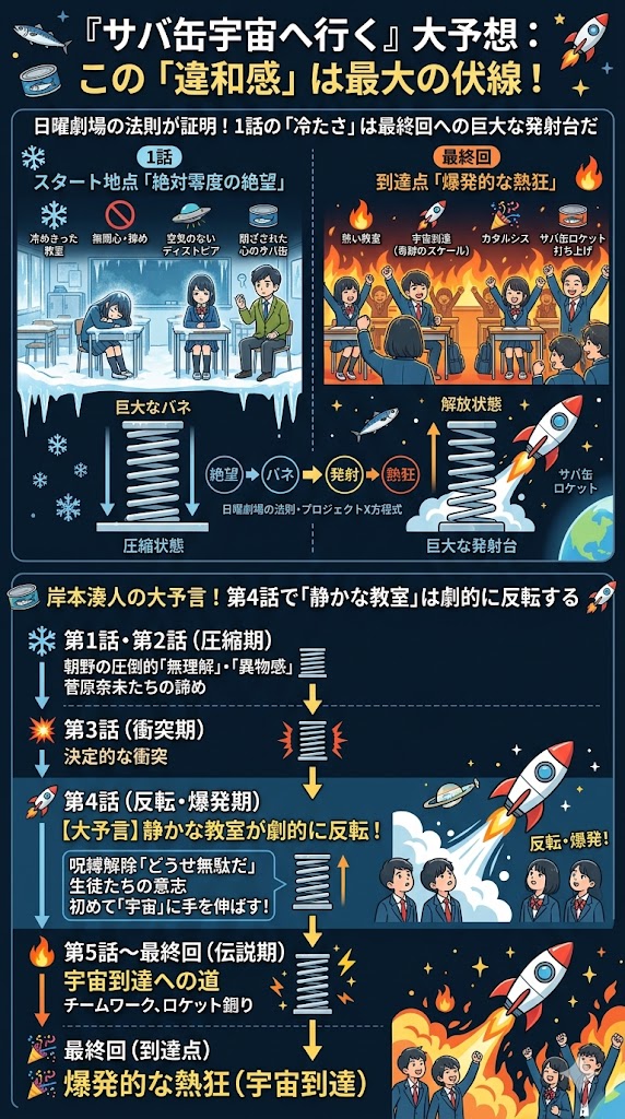 これまで数々の考察系ドラマや日曜劇場の伏線回収を見事に的中させてきた僕のロジックに照らし合わせれば、このドラマの構造は極めて明確だ。1話で徹底的に描かれたあの「冷たさ」は、最終回でサバ缶が宇宙へ飛ぶ瞬間の「爆発的な熱狂」を生み出すための、巨大なバネ(発射台)に他ならない!