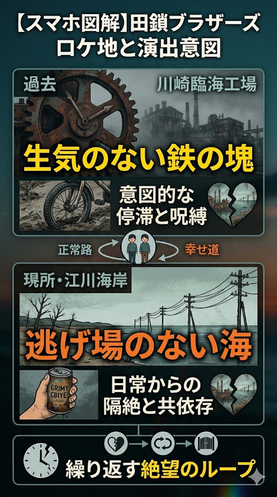 なぜ、都会のど真ん中ではなく、巨大な無機物(コンビナート)と自然(海)が隣り合う場所が選ばれたのか?それは、彼らが事件から31年間、「人間社会(日常)から隔絶された場所でしか息ができない」ことを視覚的に表現するためだ。