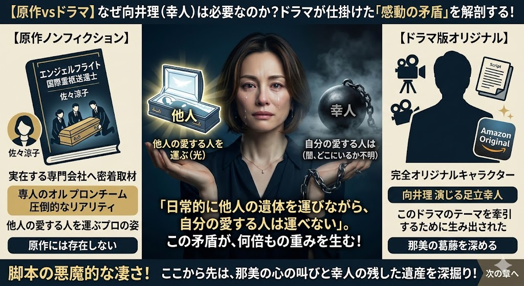 A. 主人公・那美に「他人は帰せるのに、自分の愛する人は帰せない」という究極の矛盾を背負わせることで、毎回の遺体搬送エピソードの“命の重み”を極限まで高めるためです。この設定のおかげで、作品の深みが格段に増しています。