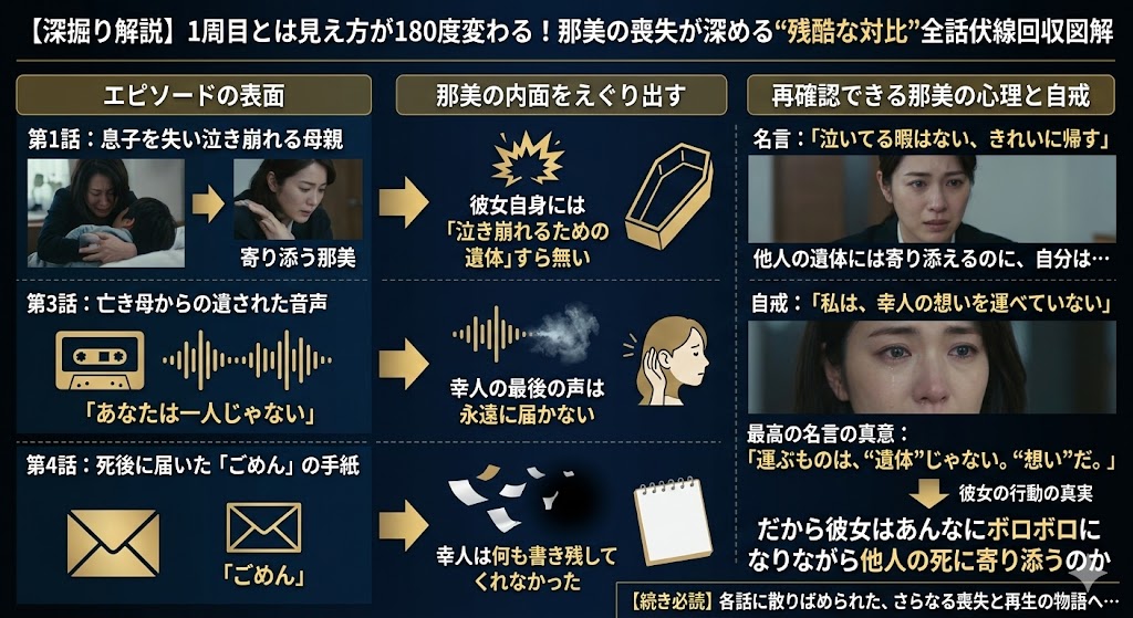 | 第1話(突然の事故死) | 息子を失い泣き崩れる母親。那美は寄り添いますが、彼女自身には「泣き崩れるための遺体」すら無いという残酷な対比。 |