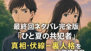 あらすじ・作品紹介(みどころ) 最終回ネタバレ完全版|“ひと夏の共犯者” 真相・伏線・裏人格すべてを暴く考察 ドラマ『ひと夏の共犯者』最終回を徹底解説。真相ネタバレ、伏線回収、裏人格の正体、主題歌「Limited Nights」とのリンクまでを深掘りします。 2025.10.03 あらすじ・作品紹介(みどころ)