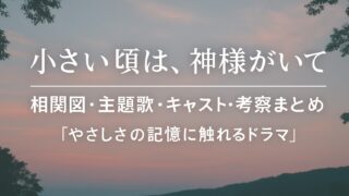 相関図(キャラクター解説) 相関図×歌詞で見る『小さい頃は神様がいて』──人物関係と“神様の記憶” ドラマ『小さい頃は、神様がいて』のあらすじ・キャスト・相関図・主題歌・考察を丁寧に解説。物語の静かな深み、登場人物の交差する想い、そして“神様の記憶”にそっと触れるようなレビューをお届けします。視聴前にも視聴後にも、心を整える読書体験を。 2025.09.25 相関図(キャラクター解説)