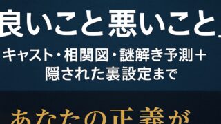 あらすじ・作品紹介(みどころ) 【完全版】『良いこと悪いこと』キャスト・相関図・謎予測・裏設定を本気で読み解く 日本テレビの秋ドラマ『良いこと悪いこと』完全ガイド。キャスト一覧・相関図・伏線の謎・黒幕予測・裏設定まで、感情に寄り添う考察で徹底解説。初見でもわかりやすく、伏線好きも満足の構成でお届けします。 2025.09.27 あらすじ・作品紹介(みどころ)