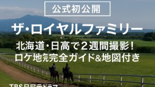 ロケ地・紹介 公式初公開:北海道・日高で2週間撮影!『ザ・ロイヤルファミリー』ロケ地完全ルポ&地図付き TBS日曜劇場『ザ・ロイヤルファミリー』のロケ地を徹底解説。北海道・日高地方での2週間撮影の舞台裏、中山・府中・船橋など関東の競馬場ロケ、キャストの証言や地図付きでリアルに追体験できます。ロケ地巡礼や撮影スポットの推定地も公開中。 2025.09.28 ロケ地・紹介