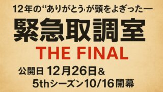 あらすじ・作品紹介(みどころ) 12年の“ありがとう”が頭をよぎった──『緊急取調室 THE FINAL』公開日12月26日&5thシーズン10/16開幕 『緊急取調室 THE FINAL』の公開日は2025年12月26日、第5シーズンの放送開始は10月16日に決定。再撮影の裏側や“総理取調べ”の衝撃展開、感謝プロジェクトの全貌も徹底解説。12年の歩みの最後を見届けるために── 2025.09.06 あらすじ・作品紹介(みどころ)