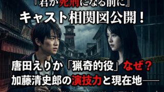 相関図(キャラクター解説) 【君が死刑になる前に】キャスト相関図!唐田えりか猟奇的役の“なぜ”と加藤清史郎の演技力 新ドラマ『君が死刑になる前に』の最新キャスト相関図を公式情報から徹底解説!加藤清史郎の進化した演技力や、唐田えりかが猟奇的な死刑囚に抜擢された「なぜ」をご本人の言葉から紐解きます。鈴木仁・与田祐希が果たす役割など、ネットの噂や疑問をスッキリ整理した放送前必読の予習記事です。 2026.04.01 相関図(キャラクター解説)