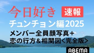 最新シリーズ・放送情報 【速報】今日好きチュンチョン編2025 メンバー全員顔写真+恋の行方&相関図<完全版> 今日好きチュンチョン編2025の全メンバー顔写真&恋の行方を徹底まとめ。ABEMA公式情報と独自分析で“恋の瞬間”をリアルに再現。放送スケジュール・相関図・マカオ編見送りの真相まで、完全保存版でお届けします。 2025.10.10 最新シリーズ・放送情報